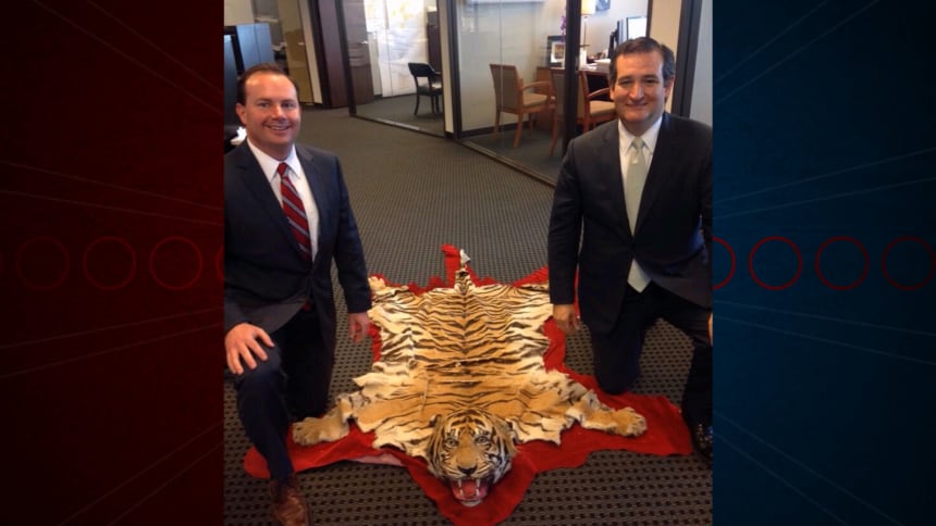 Cruz tweeted on Wednesday, “Did a little shopping for the office with @SenMikeLee in Houston today,” and attached a photo of himself and Lee on bended knee beside the rug.