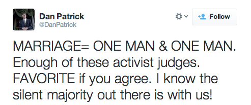 Upon hearing that Texas’ ban on same-sex marriage was struck down, State Sen. Dan Patrick tweeted: