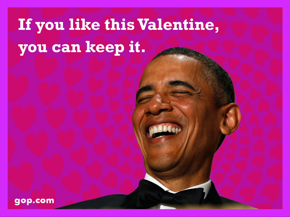 The GOP is getting into the Valentine’s Day spirit with political and pun-filled online cards. The website lets visitors choose from eight cards, the majority of which play up conservative views, that can be emailed to your friends and family.