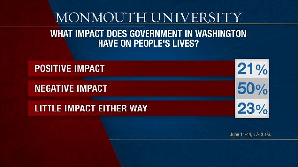 It’s no surprise the country doesn’t like Washington, but Americans remain hopeful it can change. Take a look at these numbers from a new Monmouth University poll. Half of Americans feel the current government in Washington has a negative impact on people’s lives. Just 21% say it has a positive impact
