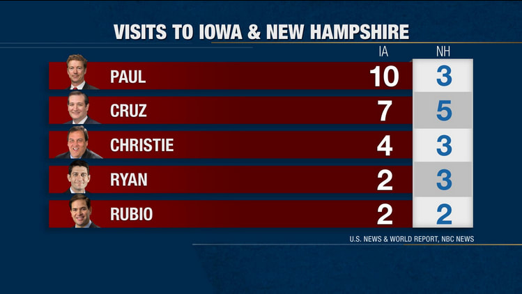 According to a report from NBC News and U.S. News and World Report, Rand Paul, Ted Cruz, Chris Christie, Paul Ryan, and Marco Rubio have made a combined forty trips to New Hampshire and Iowa. That’s four times more than their Democratic counterparts, which include Vice President Joe Biden and Brian Schweitzer. Hillary Clinton has not made stops to either state…yet.