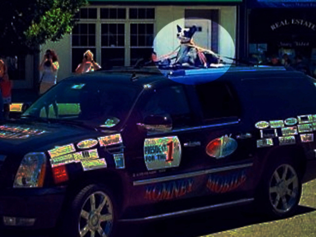 Romney’s bus followed by fake dog strapped on SUV /