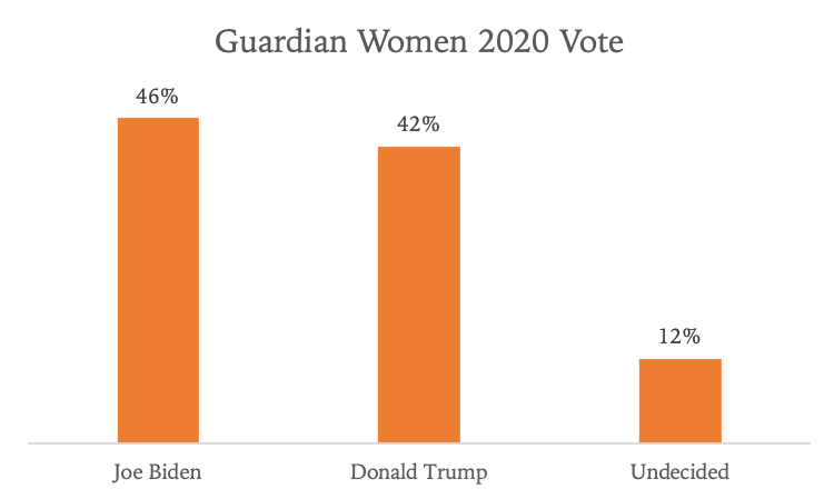 While Biden has a narrow four-point lead among these women, the undecided Guardian Women lean to Trump, though the margin is small. By comparison, women overall vote for Biden by 16 points – 53 percent to 37 percent and the undecided women lean solidly to Biden.