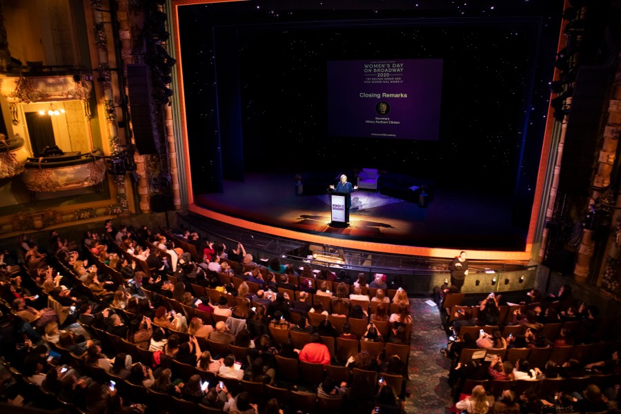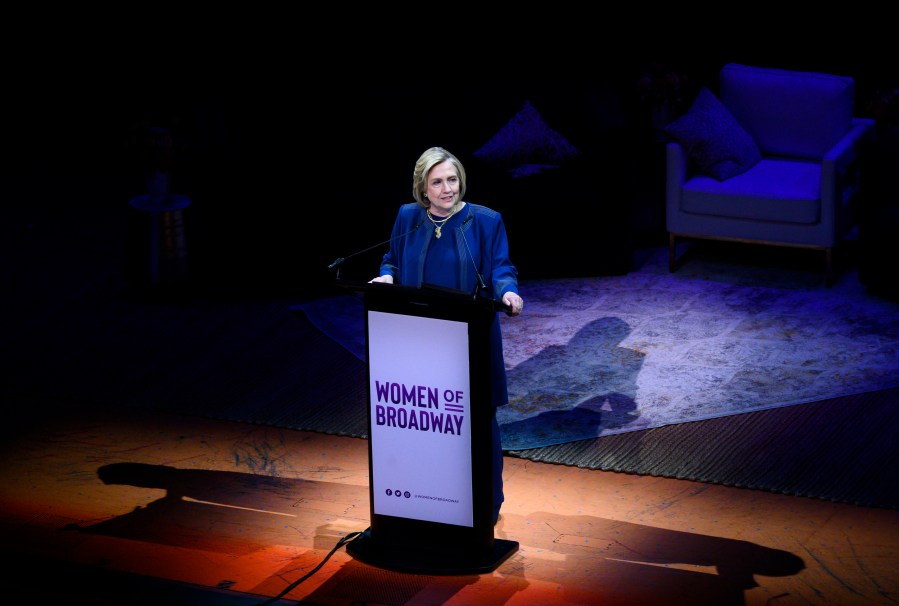 Former first lady and secretary of state Hillary Clinton spoke at the third annual Women’s Day on Broadway to praise accomplished women in theater