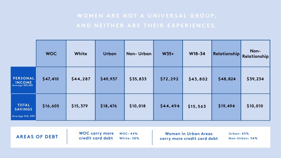 No matter how many financial rule books you scope out, they have little impact if they don’t address your own personal financial narrative. Even the survey statistics above vary depending on where you live. And in terms of demographics, while overall, the same percentage of women of color and white women had less than $250 in their savings (28 percent), black women were more likely to fall in this bucket (33 percent).