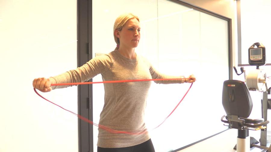 “This is an easy way for a woman who just had a baby to activate their upper torso area,” Morando said, with Lamoureux-Morando demonstrating the moves. First, bend your knees slightly – a key “base” position for any exercise to keep your joints safe and the pressure off your abs, Morando said. Next, hold out a resistance band with both arms straight out in front of you. Keep your arms as straight as possible; pull the band on each end until the band touches the highest point of your chest; and release back outward.