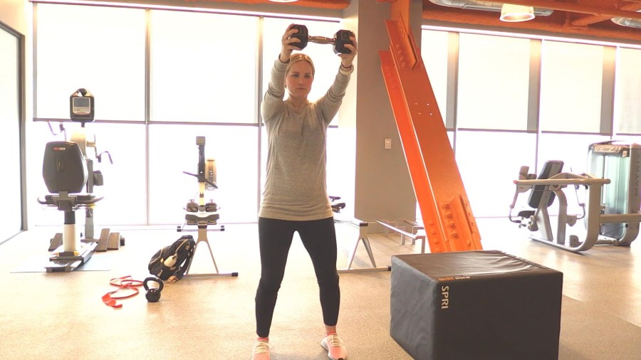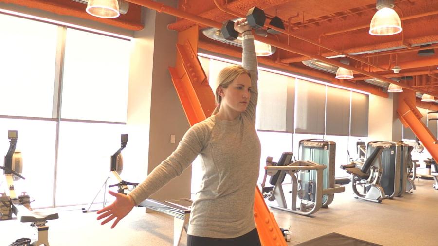 Morando employs two types of presses. The first is horizontal: Stand with slightly bent knees, and hold each end of the dumbbell in your hands. Press it up at a 45-degree angle — or vertically if the diagonal angle hurts your shoulder or otherwise doesn’t feel right — and bring your elbows back in. Again you’ll complete three to four sets of eight to 12 reps.