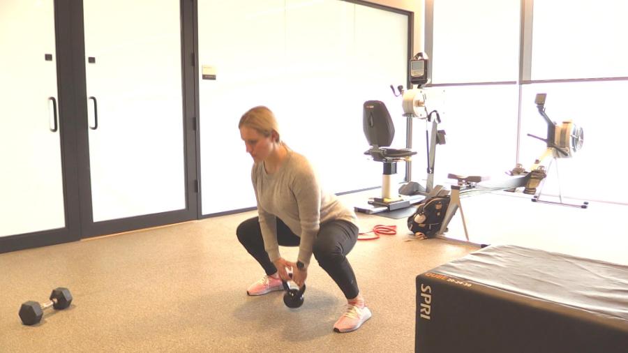 Place your legs a little wider than your shoulders, and line up a kettlebell with your heels. Bend your knees slightly, and squat down to reach the kettlebell. Check here to make sure the exercise feels OK with your back in particular, Morando said, and elevate your hips slightly if it doesn’t feel right. “The No. 1 goal with this exercise is to have a neutral spine,” he explained.