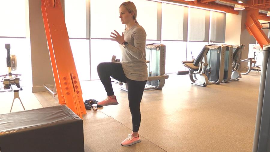 This time you’ll use a smaller, thicker band that can be used to move your legs in a linear direction, lateral direction or multi-direction. Place the band below your knees. As always, start by bending knees slightly. Place your feet about shoulder-width apart and start in the linear direction: Step one foot forward, then back, for about three to four sets of eight to 12 reps. You’ll repeat on the other side next. End the linear portion by alternating legs in the same sets. “Here we’re preparing her pelvis to create stability around the hip, back and ab region,” Morando said. Next you’ll repeat the whole series, but this time in the lateral direction: Step your right leg out further to the right, then back in. Once you complete those sets, switch to the left foot. Finally, alternate your legs in the same sets.