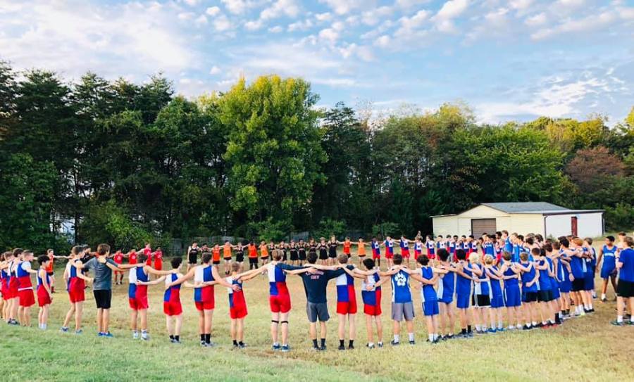 Josh Folsom, 17, high fives his high school cross country coach during the final race of his senior year season at West Potomac High School, Alexandria, VA.Courtesy of Jennifer Folsom.