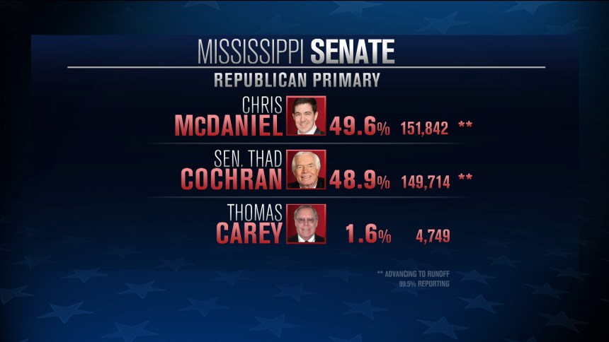 After months of grueling (and expensive) campaigning between incumbent Sen. Thad Cochran and conservative challenger Chris McDaniel, Mississippi Republicans can look forward to another three weeks of grueling — and, again, expensive — campaigning after the two candidates appeared to force a runoff on Tuesday with almost all the votes counted.