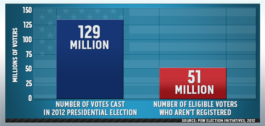First among them is the voter registration system. A Pew study last year found that voter rolls contain more than 4.5 million duplicates or names of dead people—a problem Republicans say requires urgent attention since it could allow for fraud. Meanwhile, at least 51 million eligible citizens—almost a quarter of the eligible population, and far more than the total number of voters likely to be disenfranchised by voter ID laws and other GOP-backed restrictions—still aren’t registered (see chart below). That’s something Democrats want to address, because that population likely leans toward their party.