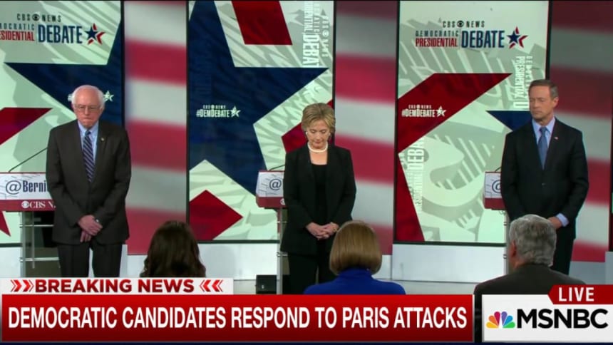 The candidates spent the first 35 minutes of the debate discussing terrorism and foreign policy in the aftermath of the attacks in Paris, which left at least 129 people dead and hundreds more injured. Despite her strength, Clinton found herself on defense for much of this foreign policy portion, once again atoning for her vote for the Iraq War and trying to find a silver lining on the Libya intervention that toppled strongman Muammar Gaddafi but left the country in chaos.