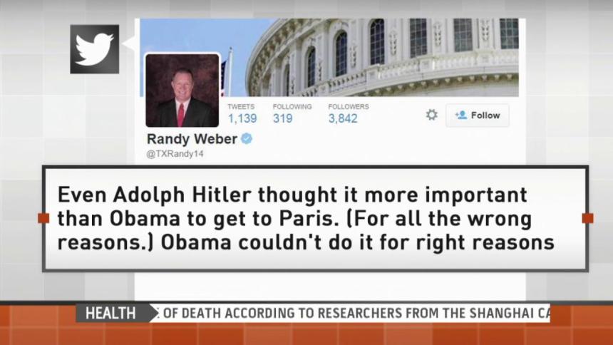 The Texas Congressman criticized President Obama on Twitter for his absence at Sunday’s Unity Rally in response to terror attack in Paris, which many other world leaders attended. Weber tweeted: “Even Adolph Hitler thought it more important than Obama to get to Paris. (For all the wrong reasons.) Obama couldn’t do it for right reasons.”