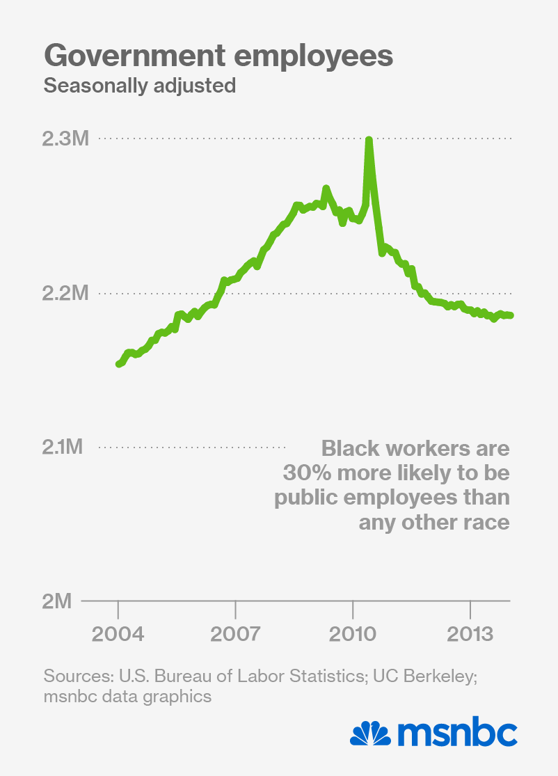 But post-recession government austerity has dramatically reshaped the landscape of public employment. Black workers aren’t the only population to be affected by widespread government layoffs, but they might be the most vulnerable. After all, median household income for African Americans tends to lag behind white income, and black unemployment is consistently twice as high as white unemployment. For black families, that means losing a solid middle-class job has the potential to be even more devastating.