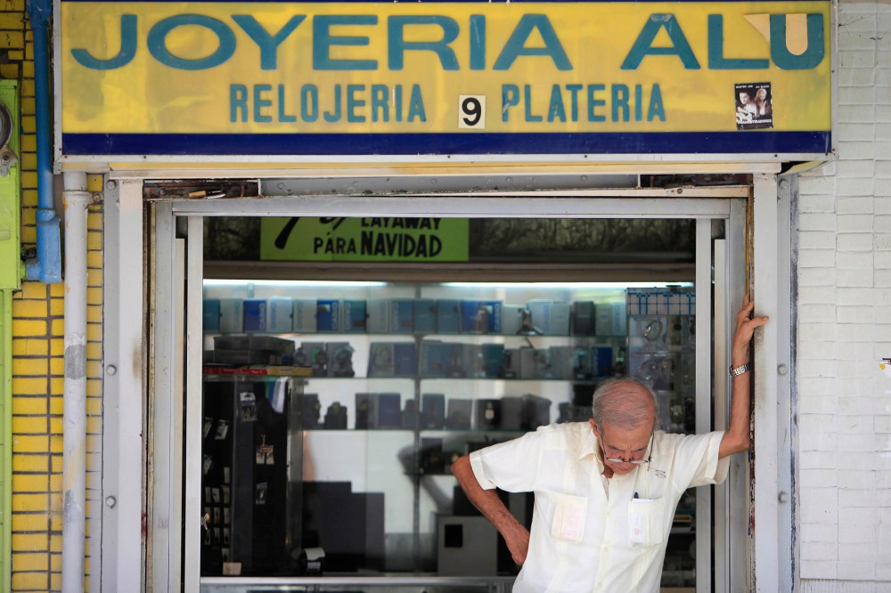 A man stands in front of a jewelry store in the neighborhood of Rio Piedras in San Juan, Puerto Rico, June 29, 2015.AP