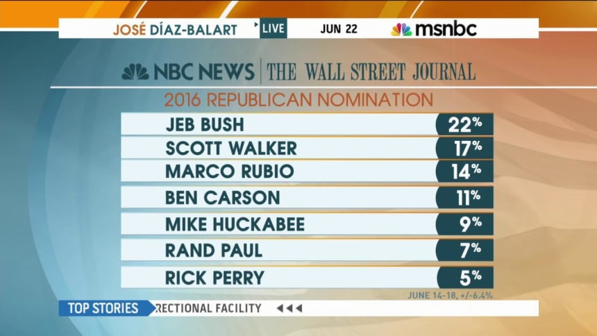 Jeb leads the GOP pack, according to brand-new national NBC/WSJ poll… Who makes that first debate, per the poll? And who gets left off?… Full NBC/WSJ poll comes out at 6:30 pm ET… What dynasty issue?… GOP candidates divided over South Carolina’s Confederate flag… And Rick Perry on how NOT to talk about the Charleston shooting.
