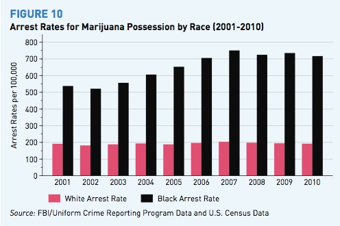 Although marijuana use among blacks and whites is about the same, according to a 2013 report by the ACLU, blacks are almost four times more likely than whites to be arrested for marijuana possession. This startling graph from the report tells the story: