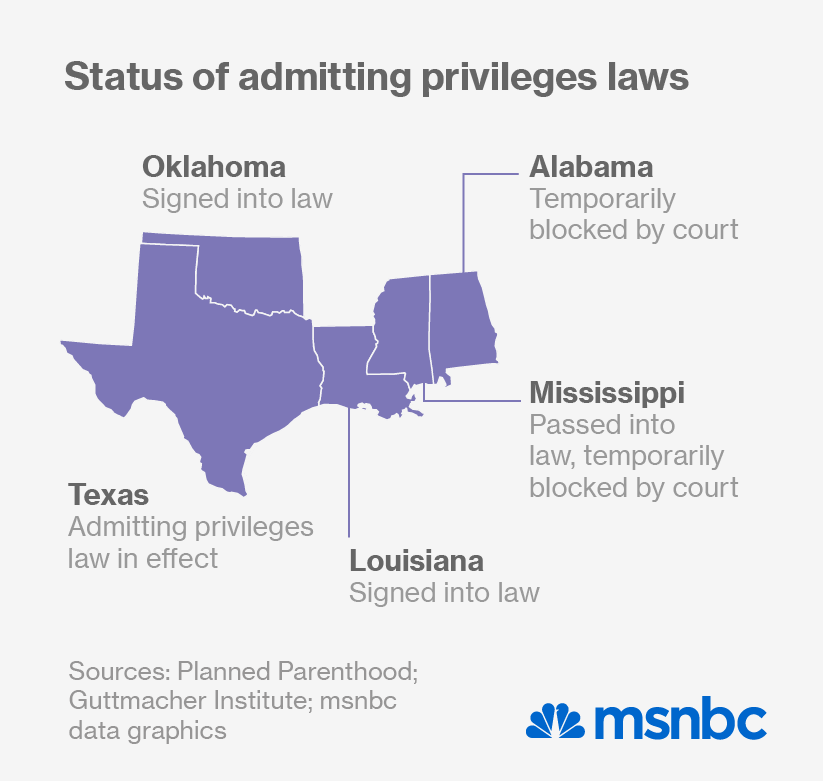 Federal courts have been split on the broader question of admitting privileges laws, and whether they violate a woman’s right to an abortion by shutting down clinics. In November, the Supreme Court signaled it had the votes to accept the case and resolve that question.