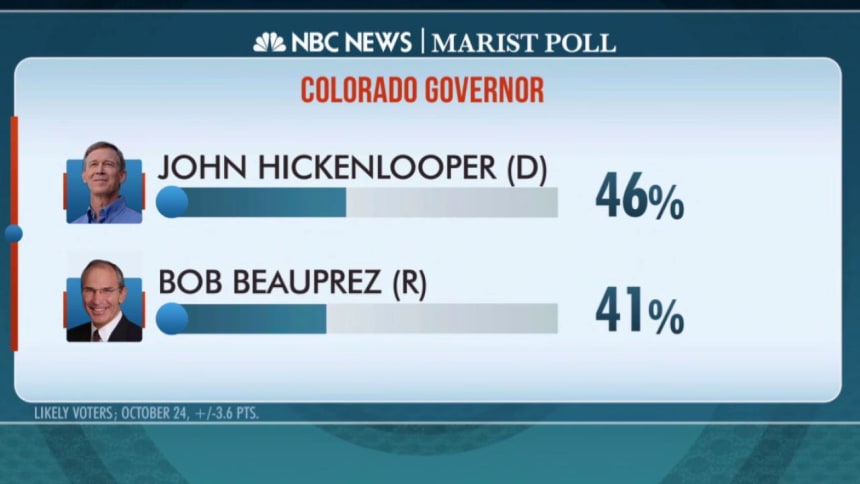 In the state’s gubernatorial race, incumbent Democratic Gov. John Hickenlooper has a five-point lead over Republican opponent Bob Beauprez, 46 percent to 41 percent.