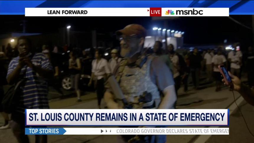 A day after a rash of gun violence on the streets of Ferguson, a small citizen militia armed with semi-automatic assault rifles was roaming those same streets overnight Monday. Known as the Oath Keepers, the men added another layer of tension onto an already volatile scene.