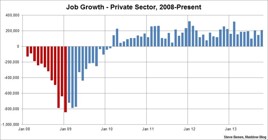 That’s better than the past year, on average, when job growth has averaged 190,000 per month. Revisions also added 60,000 more jobs to August and September. The jobs report suggests that the economy is picking up in spite of everything that Washington has done to get in its way. In terms of payroll numbers, “there were no discernible impacts of the partial federal government shutdown on the estimates of employment, hours, and earnings,” the Bureau of Labor Statistics said.