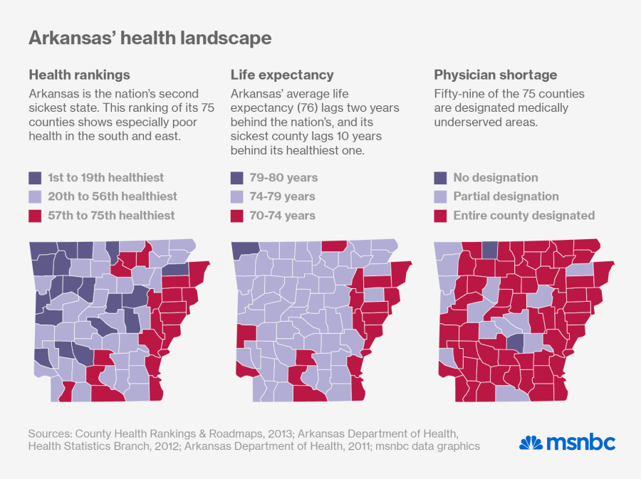 Arkansas is the second sickest state in the nation (Mississippi, its eastern neighbor, takes the prize), and it lags far behind national averages on most measures of human development, from education and income to life expectancy. A fifth of its 2.9 million residents live in poverty, a similar proportion lack health insurance, and even those with coverage often get low-quality care. In 2011, a statewide survey found that only 28% of diabetics and 30% of people with high blood pressure had their conditions under control. All this despite a decade of devastating, unsustainable increases in health-care spending.