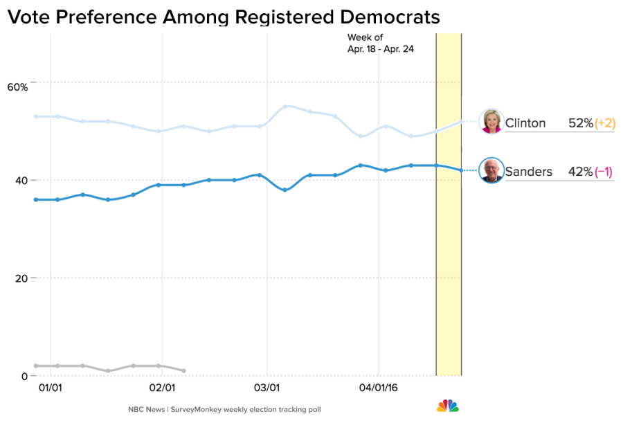 After Hillary Clinton’s decisive win in New York last week—ending her string of losses—she now has a 10-point lead over Bernie Sanders nationally. Though the margin between the candidates increased only slightly from 9 points last week, the latest numbers show a slow but steady national climb by Clinton over the past three weeks, according to the latest from the NBC News|SurveyMonkey Weekly Election Tracking Poll.