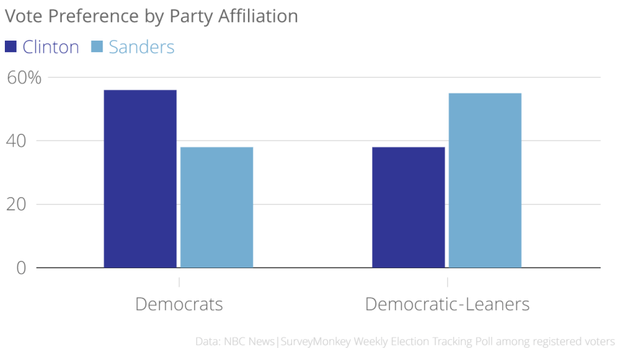 In this week’s poll, Clinton captures 56 percent support among registered voters who say they identify as Democrats. Sanders has 38 percent support of Democrats. This margin flips in Sanders’ favor, however, among Independents who lean toward the Democratic Party. This group supports Sanders over Clinton, 55 percent to 38 percent.