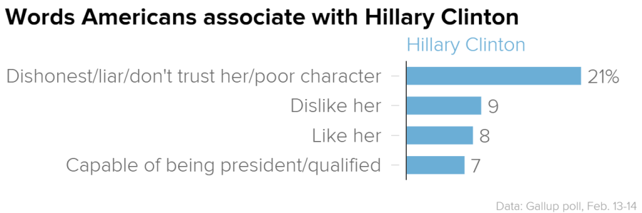 For Clinton, 21 percent said “dishonest/liar/don’t trust her/poor character,” according to a Gallup poll released on Tuesday. For Sanders, 12 percent said “socialist,” which comes as no surprise after the Vermont senator has promoted his brand of “democratic socialism” throughout the campaign. Six percent described Sanders as “older” or “aged.”