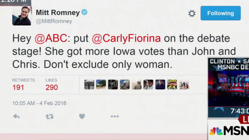 Hey @ABC: put @CarlyFiorina on the debate stage! She got more Iowa votes than John and Chris. Don't exclude only woman.