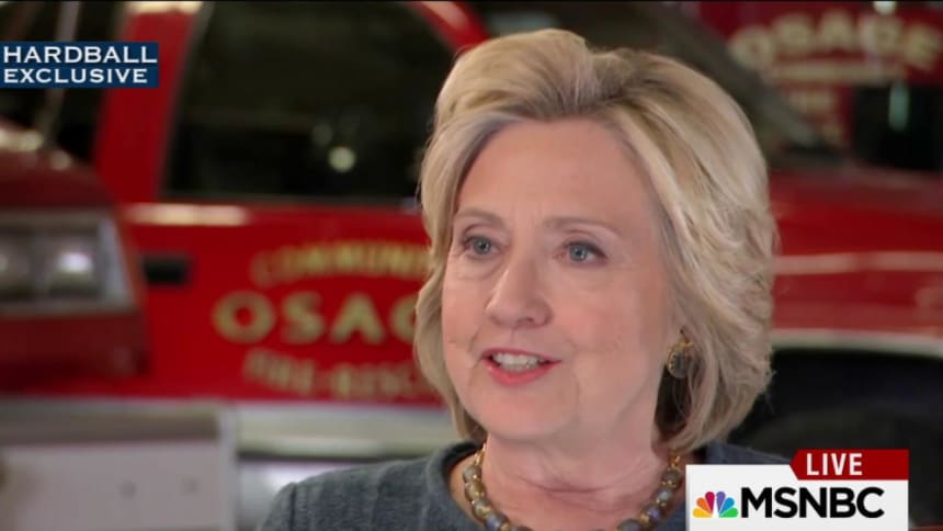 In her first national television interview of the year following a campaign stop Tuesday in Osage, Iowa, the Democratic presidential front-runner refused to respond to the more pointed barbs from her Republican counterpart, Donald Trump, choosing instead to repeatedly stress a message of unity on issues ranging from gun control to international terrorism. The exclusive interview with Chris Matthews, the host of MSNBC’s “Hardball,” came one day after Clinton told voters in Cedar Rapids that her New Year’s resolution was to avoid any slugfests with the sharp-tongued real estate mogul.