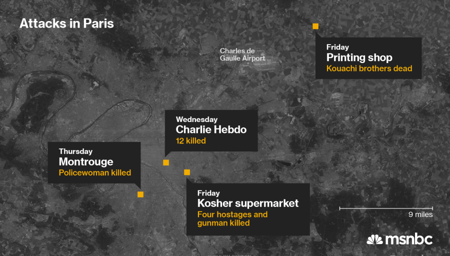 From the bloodstained conference room of a weekly satirical magazine, to the merciless shooting of a Paris police officer in the middle of the street. From the fatal shooting of a traffic officer at the southern edge of Paris to the armed robbery of a gas station 50 miles north of the city.