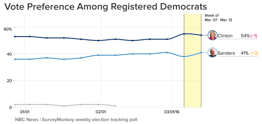 Clinton’s overall numbers dipped to a 13-point lead over Sanders, perhaps due to Sanders’ surprising win in Michigan on March 8.