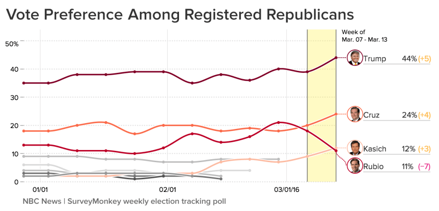 Ted Cruz is behind Trump with 24 percent, followed by John Kasich and then Marco Rubio. These results are according to the NBC News|SurveyMonkey Weekly Election Tracking Poll for the week of March 7 through March 13, 2016 among a national sample of 8,840 adults aged 18 and over, including 7,321 who say they are registered to vote.