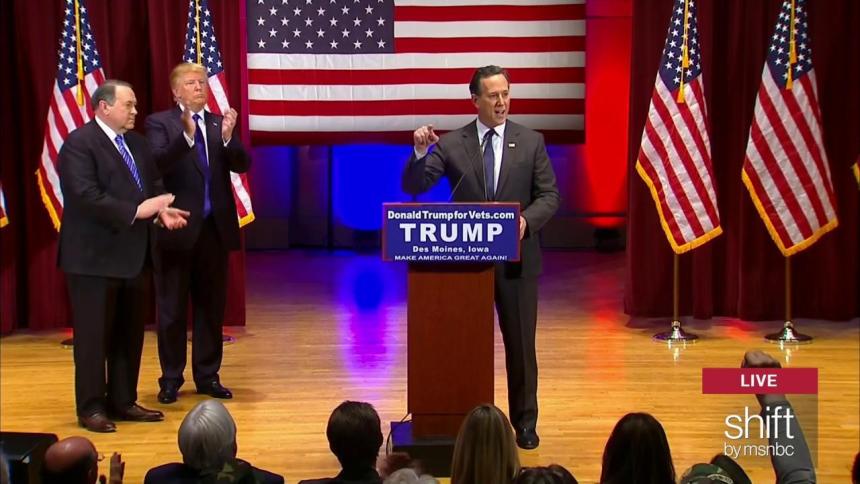 “I’m going to stand over here,” Santorum said standing slightly off to the side of the Trump-emblazoned podium with a smile. “So I’m not photographed with the Trump sign.”