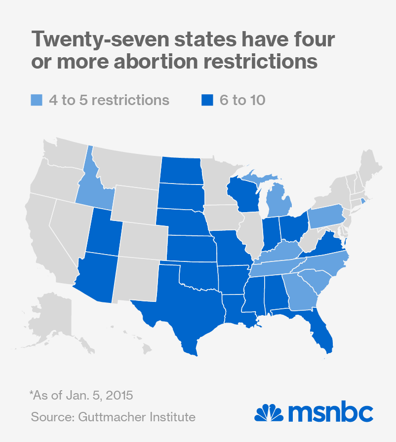 The high-water mark for such laws was 2011, with a slight diminishment in 2014, during which only 26 new abortion restrictions were passed. The cumulative effect, Guttmacher notes, is that “the proportion of women living in hostile states has surged as well. In 2000, 31% of women of reproductive age lived in a state hostile to abortion rights, with no women living in a state with enough restrictions to be considered extremely hostile. By 2014, 57% of women lived in a state that is either hostile or extremely hostile to abortion rights.”