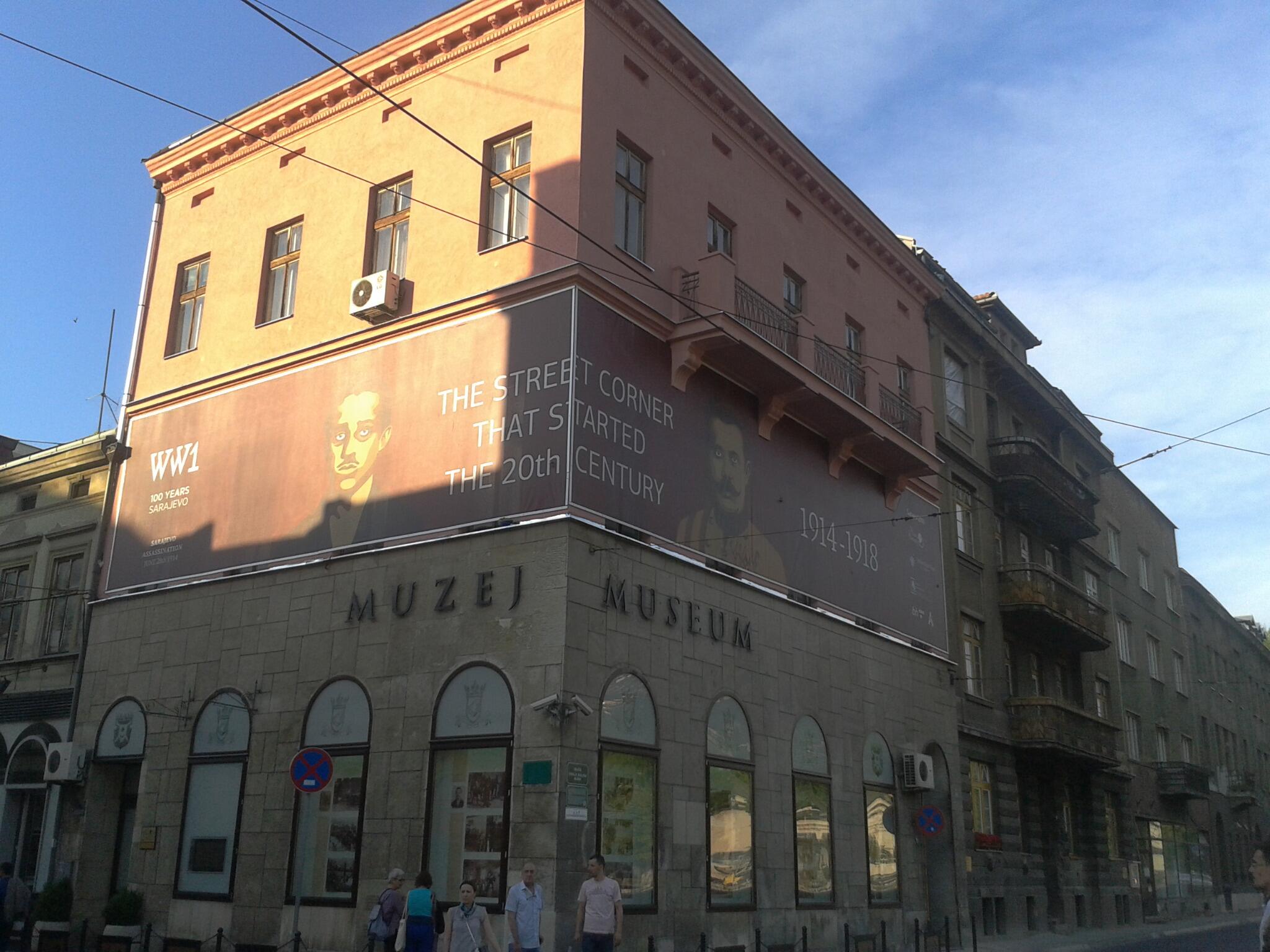 “THE STREET CORNER THAT STARTED THE 20TH CENTURY” blares a purple banner situated where the Austro-Hungarian Archduke Franz Ferdinand’s car took a wrong turn in Sarajevo (then part of Austria-Hungary) onto Franz Josef Street. While the Archduke’s driver halted and laboriously turned the car around, Gavrilo Princip, a 19-year-old Bosnian Serb, shot and killed the Archduke and his pregnant wife, Sophie.