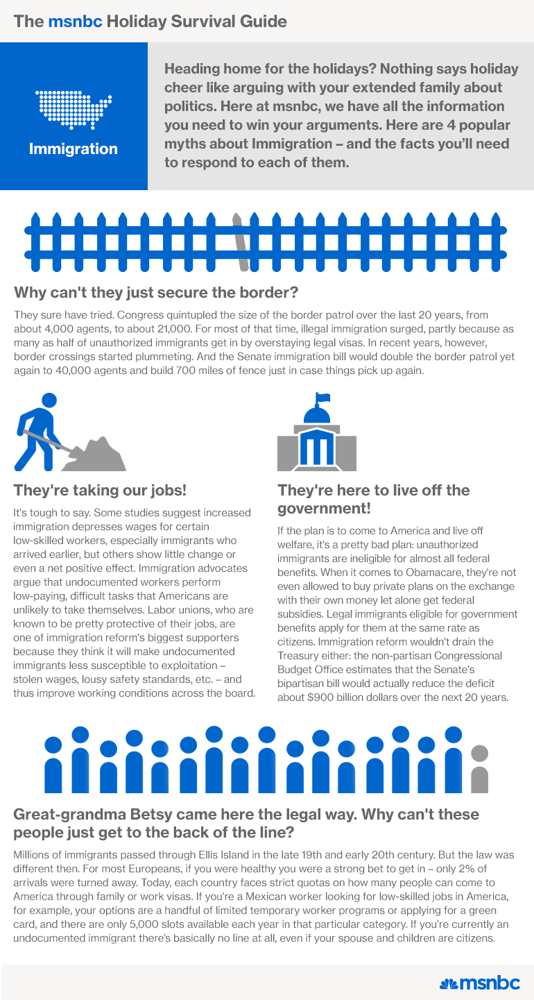 The holidays are a wonderful time of year, bringing families together from around the country to share quality time and – political debates? Everyone has that one relative – or relatives – who can’t resist a political discussion at the dinner table or around the Christmas tree. So when the inevitable happens, we’ve got you covered with a handy guide to debunking some of the most common myths you’ll hear about the War on Christmas, immigration, the economy, voting rights, and more.