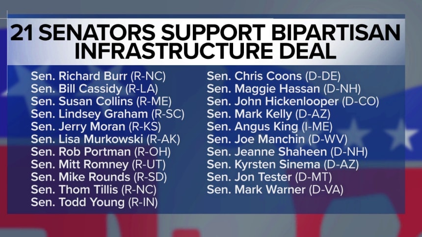 Meanwhile, both parties’ leaders are looking ahead to what comes after any deal is passed. Senate Majority Leader Chuck Schumer, D-N.Y., has made it clear that he means to keep working on a two-track plan: getting the best bipartisan deal possible and pushing through other parts of the Democrats’ agenda on a party-line vote. The latter would come in the form of a reconciliation bill, which needs only 51 votes to pass, and it could include any parts of Biden’s plan that get left out of a bipartisan deal.