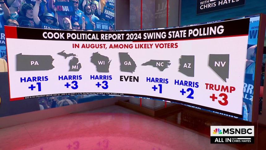 (For the record, NBC News hasn’t released a national survey since Biden dropped out, but in its most recent poll conducted in July, in a then-hypothetical question about what voters might do if Biden discontinued his campaign, Harris was running behind Trump, 47% to 45%, with a margin of error of 3.46%.)