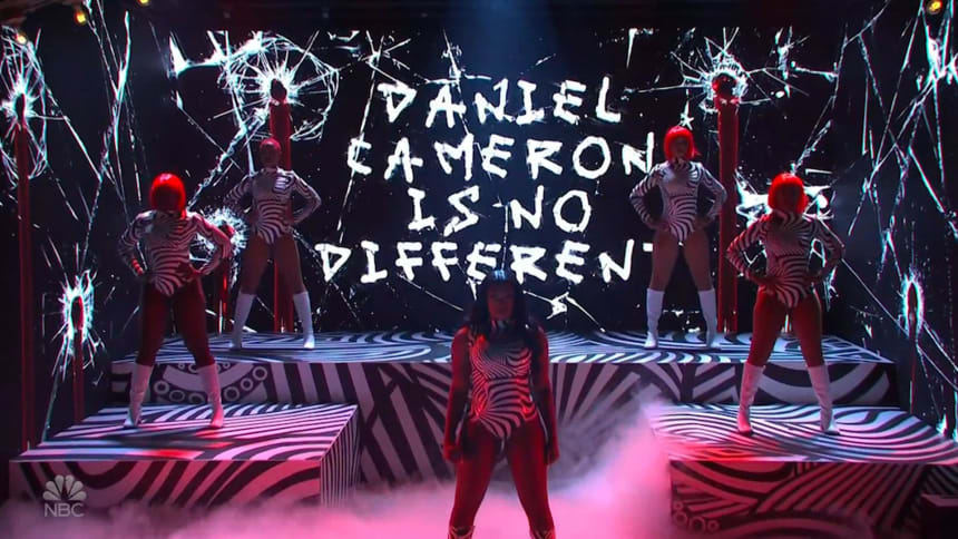 In another scene, we see Megan trapped inside a display case, peeling dead skin from her face and fully naked body as serpentine human spectators silently record her molting. Each bar lays bare a tortuous torment: the death of her parents, being cheated on and exploited, alcoholism, sleeplessness, anxiety, depression and thoughts of self-harm. She pleads, “Lord, give me a break. I don’t know how much more of this s— I can take.”