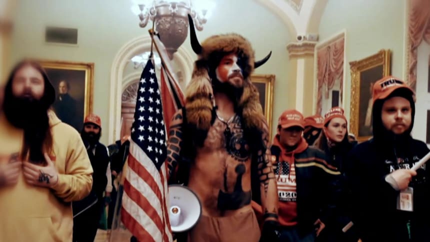 Photo illustration showing protestors storming the U.S. Capitol in the background with a red strip in the middle that has the faces of Xi Jinping, Vladimir Putin and Kim Jong Un.