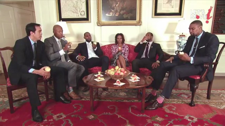 In the clip, Miami Heat head coach Erik Spoelstra, along with teammates Dwyane Wade and Ray Allen, conducted a courtside-style interview in the White House about their healthy habits. Then the first lady, LeBron James, and Chris Bosh run around behind them chomping on apples, sipping water, and showing off for the camera.