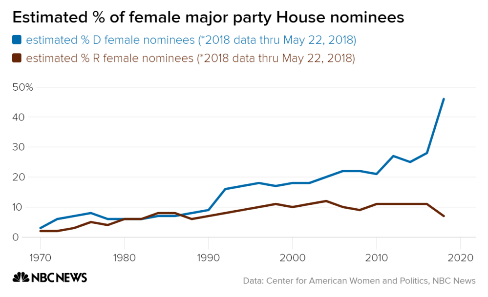 For those committed to feminist principles and greater representation for women in positions of power, this is an amazing development. It’s also historic: as the above chart from NBC News shows, American voters have never seen so many women win major-party congressional nominations.