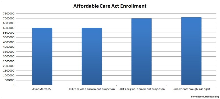 Note for context, the original projection from the Congressional Budget Office was for 7 million, but that was downgraded to 6 million when healthcare.gov faltered in October and November, when it seemed 7 million was an overly ambitious pipe dream.
