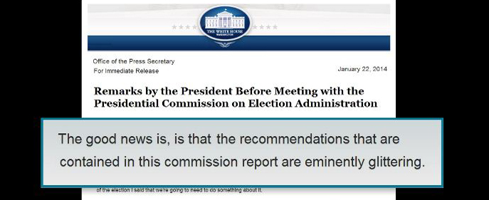 As Rachel reported tonight, a transcriber for the White House Office of the Press Secretary included the phrase “eminently glittering” in the posted transcript of President Obama’s remarks today concerning the Presidential Commission on Election Administration report. Both the Washington Post and Politico used the phrase in their reporting on what the president had to say.