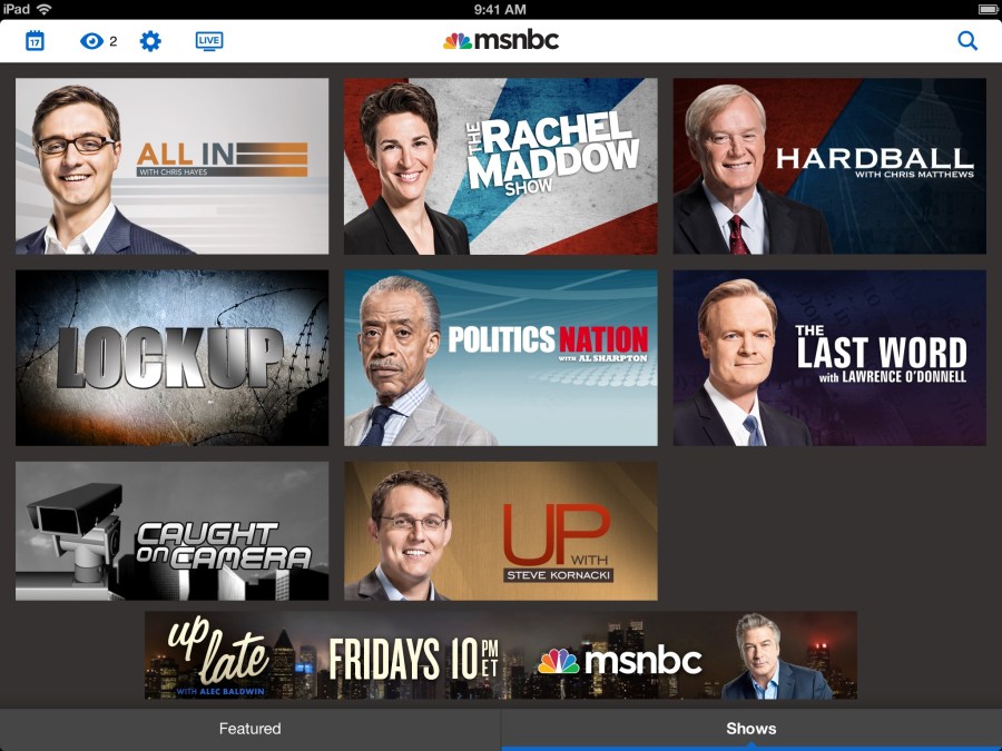The hardcore among you will remember the launch of the The Rachel Maddow Show iPhone app way back in May, 2009. Or perhaps you were around for the launch almost 2 years ago of the MSNBC featuring The Rachel Maddow Show iPad app. Part of the mission with the iPad app was to use it as a stepping stone to bring the other msnbc shows into the app space. This new launch is a nice big step in that direction. We don’t have everyone in there yet, but that’ll come up future updates.