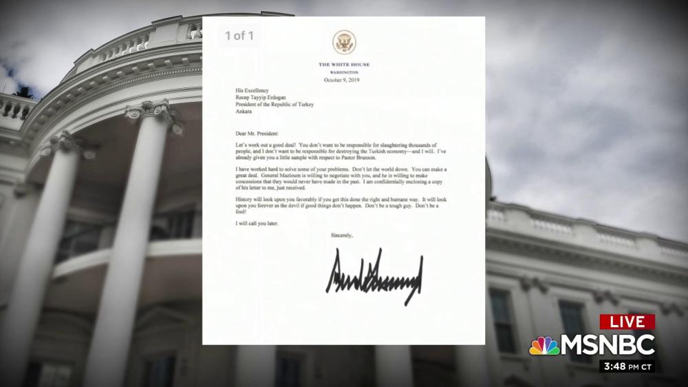 Last week, as Donald Trump moved U.S. troops out of northern Syria, clearing the way for a Turkish military offensive against our Kurdish allies, the American president reached out to Turkish President Recep Tayyip Erdogan, urging him to show some restraint. That, in and of itself, hardly seems notable.