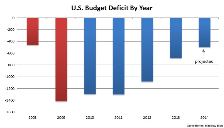 To reiterate a point from last fall, I should note that I don’t consider this sharp reduction in the deficit to be good news. On the contrary, I strongly believe the nation should be borrowing more, not less, taking advantage of low interest rates, investing heavily in infrastructure and economic development, creating millions of jobs, and leaving deficit reduction for another day.